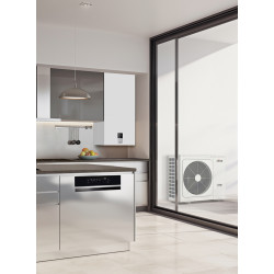Tipo de ventiladores: DC axial, Tipo de refrigerante: R32, Medidas alto / ancho / fondo: 86,5 / 111,8 / 52,3 cm Tipo de intercambiador: Batería aleteada con aluminio hidrofílico, Tipo de bomba: Bomba modulante electrónica (9 mca), Conexiones de ACS: 3/4” GAS F