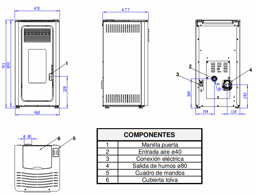 Potencia nominal 8,2 kW, para estancias de 68 m2, rendimiento 93%, contenedor pellets 21Kg, medidas alto/ancho/fondo 101x49x49cm.