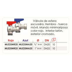 Incluye un mando minimariposa en color rojo o azul (especificar en pedido), lo que permite una fácil identificación del uso del agua fría o caliente en sistemas domésticos o industriales. Además, su conexión hembra con tuerca móvil (H-H) de 3/4” y un diámetro nominal DN20 la hace compatible con una amplia variedad de sistemas de tuberías.