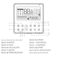 Entre sus funciones más destacadas se encuentran el temporizador semanal, el modo "Sígueme", Turbo, auto-reinicio, así como múltiples velocidades del ventilador, incluyendo ajustes desde 20% hasta 100%, ofreciendo así un control preciso y personalizado de la climatización.