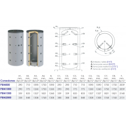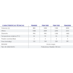 Depósito de acumulación para circuito primario de agua caliente o fría para calefacción/refrigeración, producida por cualquier fuente de energía, tradicional o renovable. Calderín: Acero al Carbono, Capacidad: 1000 litros, Medidas: 205x93cm, Tipo soporte: Arillo inferior, Conexiones circuito: 1" 1/4, Presión de trabajo del depósito: 4 bar