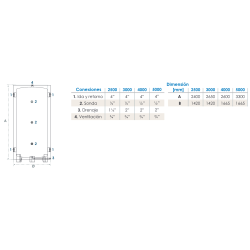Calderín: Acero al Carbono , Capacidad: 600 litros, Medidas: 173x77 cm, Superficie serpentín: 1,83 m2. Depósito acumulador de inercia, para circuitos cerrados de calefacción o refrigeración. Instalación vertical sobre suelo.