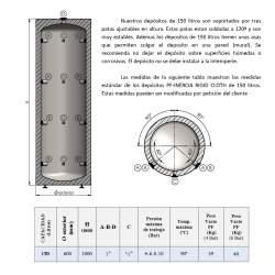 Calderín: Acero al Carbono , Capacidad: 800 litros, Medidas: 184x95 cm, Superficie serpentín: 2,70 m2. Depósito acumulador de inercia, para circuitos cerrados de calefacción o refrigeración. Instalación vertical sobre suelo.