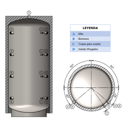 Depósito de acumulación con serpentín para circuito primario de agua caliente o fría para calefacción/refrigeración, producida por cualquier fuente de energía, tradicional o renovable. Calderín: Acero al Carbono, Capacidad: 3000 litros, Medidas: 235x160cm, Superficie intercambiador: 6,48 m2, Tipo soporte: Arillo inferior, Conexiones circuito: 3", Presión de trabajo del depósito: 4 bar