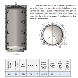 Este modelo cuenta con una capacidad de 600 litros, con conexiones de circuito de 1" 1/4, y soporta una presión de trabajo de 4 bar dentro de un rango de temperatura de 0°C a 90°C. Puede utilizarse con agua o con una mezcla de agua y anticongelante de hasta el 45%.