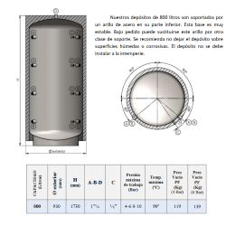 Este modelo cuenta con una capacidad de 800 litros, con conexiones de circuito de 1" 1/4, y soporta una presión de trabajo de 4 bar dentro de un rango de temperatura de 0°C a 90°C. Puede utilizarse con agua o con una mezcla de agua y anticongelante de hasta el 45%.