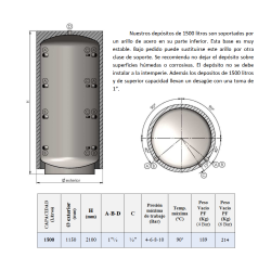 Este modelo cuenta con una capacidad de 1500 litros, con conexiones de circuito de 2", y soporta una presión de trabajo de 4 bar dentro de un rango de temperatura de 0°C a 90°C. Puede utilizarse con agua o con una mezcla de agua y anticongelante de hasta el 45%.