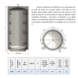 Este modelo cuenta con una capacidad de 2500 litros, con conexiones de circuito de 2", y soporta una presión de trabajo de 4 bar dentro de un rango de temperatura de 0°C a 90°C. Puede utilizarse con agua o con una mezcla de agua y anticongelante de hasta el 45%.