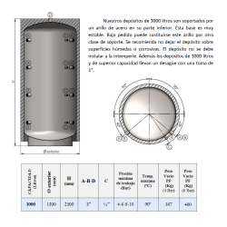 Este modelo cuenta con una capacidad de 3000 litros, con conexiones de circuito de 3", y soporta una presión de trabajo de 4 bar dentro de un rango de temperatura de 0°C a 90°C. Puede utilizarse con agua o con una mezcla de agua y anticongelante de hasta el 45%.