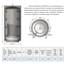 Calderín: Acero al Carbono , Capacidad: 800 litros, Medidas: 184x95 cm, Superficie serpentín: 2,70 m2. Depósito acumulador de inercia, para circuitos cerrados de calefacción o refrigeración. Instalación vertical sobre suelo.