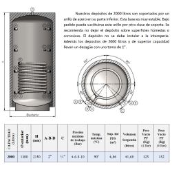 Calderín: Acero al Carbono , Capacidad: 2000 litros, Medidas: 228x136 cm, Superficie serpentín: 3,1 m2. Depósito acumulador de inercia, para circuitos cerrados de calefacción o refrigeración. Instalación vertical sobre suelo. Con conexión roscada lateral para resistencia eléctrica de calentamiento opcional.