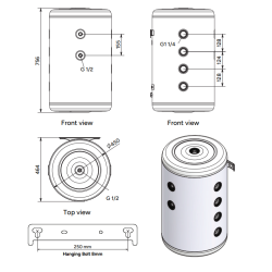 Calderín: Acero al Carbono , Capacidad: 1500 litros, Medidas: 232x116 cm, Superficie serpentín: 3,30 m2. Depósito acumulador de inercia, para circuitos cerrados de calefacción o refrigeración. Instalación vertical sobre suelo.