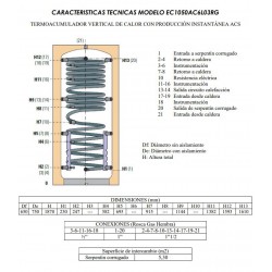 Termoacumulador constituido por un depósito en acero al carbono, un serpentines fijos en acero al carbono, y un serpentín corrugado de acero inoxidable AISI 316L, idóneo para estar en contacto con agua potable de acuerdo al Reglamento 1935/2004, para la producción instantánea de agua caliente sanitaria. El intercambio de calor para la producción de ACS se produce a través de la superficie corrugada del serpentín, inmerso dentro del depósito principal de acero al carbono.