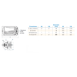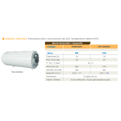 Su serpentín de gran superficie (0,59 m²) permite un intercambio térmico rápido y eficaz, lo que optimiza el rendimiento energético. Además, incluye ánodo de magnesio, válvula de seguridad calibrada a 8 bar, resistencia eléctrica, termostato interno y selector ON/OFF, brindando un control completo y seguro del sistema. Diseñado para instalación mural horizontal, sus medidas son 117x46,2 cm, soportando una presión de trabajo de hasta 6 bar y una temperatura máxima de 95°C.
