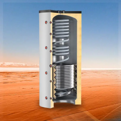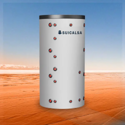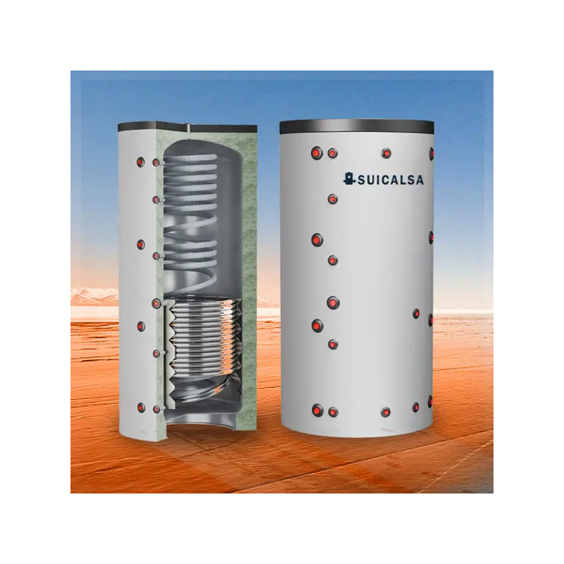 Termoacumulador constituido por un depósito en acero al carbono, dos serpentines fijos en acero al carbono, y un serpentín corrugado de acero inoxidable AISI 316L, idóneo para estar en contacto con agua potable de acuerdo al Reglamento 1935/2004, para la producción instantánea de agua caliente sanitaria. El intercambio de calor para la producción de ACS se produce a través de la superficie corrugada del serpentín, inmerso dentro del depósito principal de acero al carbono.