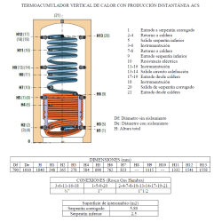 Termoacumulador constituido por un depósito en acero al carbono, un serpentín fijo en acero al carbono, y un serpentín corrugado de acero inoxidable AISI 316L, idóneo para estar en contacto con agua potable de acuerdo al Reglamento 1935/2004, para la producción instantánea de agua caliente sanitaria. El intercambio de calor para la producción de ACS se produce a través de la superficie corrugada del serpentín, inmerso dentro del depósito principal de acero al carbono.