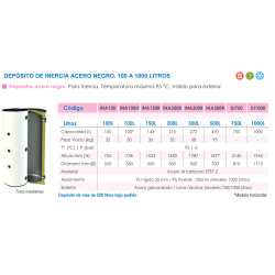 Depósitos de inercia en acero al carbono, para instalación mural (colgado en pared) o en suelo. Diseñados para trabajar en instalaciones de climatización, con rango de trabajo desde 6 ºC hasta 95 ºC y 3 bar de presión.