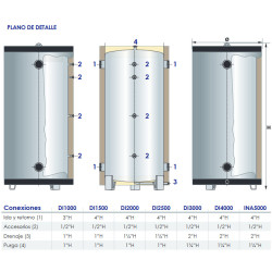 Depósito de acumulación con serpentín para circuito primario de agua caliente o fría para calefacción/refrigeración, producida por cualquier fuente de energía, tradicional o renovable. Calderín: Acero al Carbono, Capacidad: 2000 litros, Medidas: 215x140cm, Superficie intercambiador: 4,86 m2, Tipo soporte: Arillo inferior, Conexiones circuito: 2", Presión de trabajo del depósito: 4 bar