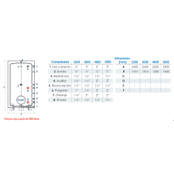 Dispone de conexiones bien distribuidas para facilitar su integración: tomas de ACS de 2", retorno de 1"¼, recirculación y resistencia opcional de 1"½, así como accesorios de maniobra de 1/2". Admite temperaturas de trabajo de hasta 90ºC y una presión máxima de 6 bares, cumpliendo con los estándares más exigentes del sector.