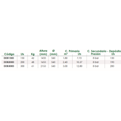 Calderín: Inoxidable AISI 444, capacidad: 500 litros, Medidas: 206 X 71 cm, Aislamiento: 5cm, Resistencia: Opcional 1"½