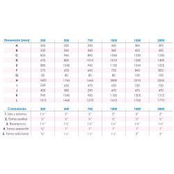 Depósito con serpentín extraíble y bocas de registro para producción y acumulación de Agua Caliente Sanitaria (ACS). Funcionamiento estándar a 8 bars en Inox 316L. Calderín: Acero inoxidable, Capacidad: 2000 litros, Serpentín Principal: 4,03 m2, Medidas: 215 x 130 cm, Tipos de boca de registro: DN400, Tipo de instalación: Vertical, Resistencia opcional.