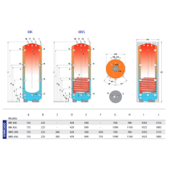 Depósito para producción y acumulación de Agua Caliente Sanitaria (ACS). Para un funcionamiento estándar a 6 bars en Inox Aisi-444. Calderín: Acero Inox, Capacidad: 100 litros, Serpentín: 0,38m2, Medidas: 105 X 50 cm, Resistencia opcional.
