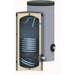 Depósito de acumulación con serpentín para circuito primario de agua caliente o fría para calefacción/refrigeración, producida por cualquier fuente de energía, tradicional o renovable. Calderín: Acero al Carbono, Capacidad: 100 litros, Superficie intercambiador: 0,38 m2, Clasificación energética: A, Medidas: 105x50cm, Tipo soporte: Mural, Conexiones circuito: 1", Presión de trabajo del depósito: 4 bar