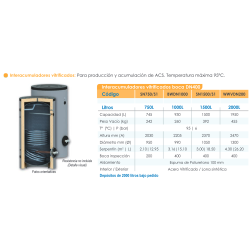 Calderín: Vitrificado , Capacidad 1000 litros , 1 serpentín de 8,00 m2 , Medidas: 221x99 , tipo soporte: Suelo , Resistencia: Opcional, Temperatura máxima trabajo: 95º, Presión máxima: 8 bar