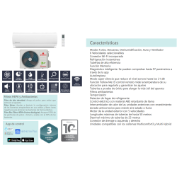 Eficiencia energética Frio: A++, Calor: A+, 2.838 Frigorias/hora, 3.182 Kcal/h, DB(A) Unidad Interior: 38 / 30 / 20, Unidad Exterior: 48 / 50