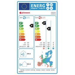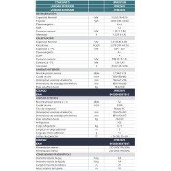 Eficiencia energética Frío: A++, Calor: A+,10.550 Frigorias/hora, 11.150 Kcal/h, DB (A) Unidad Interior: 53/50/47, Unidad Exterior: 57, Consumo anual frío: 385 kwh, Consumo anual calor: 2.308 kwh