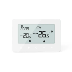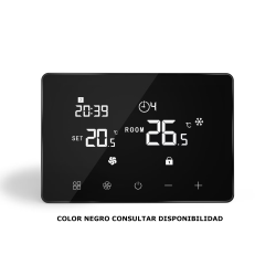 Fabricado con materiales de alta calidad, este modelo está disponible en colores blanco y negro (consultar disponibilidad) y funciona con alimentación de 220V. Su instalación en superficie y conexión por cable garantizan una comunicación estable y segura con el sistema de climatización.