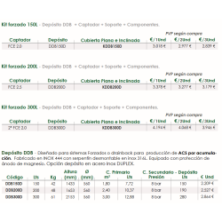 Captador: 2 placas de 2.0m2(4,0m2), Interacumulador: 300 litros 2 serpentines , Vaso acumulación: Incluido, Racores: Incluido, Instalación: Suelo ó Tejado