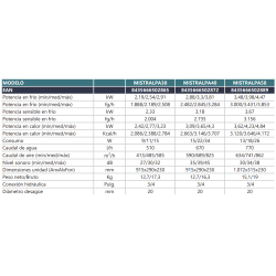 Instalación: mural, Capacidad Frigorífica/Calorífica (CC/HC) : 3,3 / 3,65 kW, Conexiones hidráulicas: 3/4" G, Peso: 16.3 kg, Medidas (AnxAlxFon): 91.5x29x23 cm