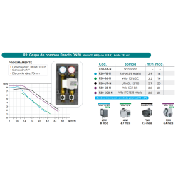 Grupo de Bombeo Compacto con Circuito Directo DN20 del Grupo R3. Potencia nominal: 35kW ( ΔT=20 K), Caudal: 1700 l/h, Altura: 3,5 mH2O, Valor Kvs: 6, Presión nominal: 10 bares, Temperatura maxima: 95ºC. Bomba: RS15/7EAY