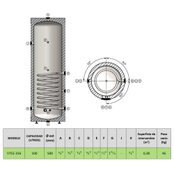 Revestimiento interno: ACERO INOXIDABLE, Capacidad Total: 105 litros, Capacidad ACS: 75 litros, Superficie de intercambio: 1,03 m2. Tank in Tank, Medidas: 85x53cm, Instalación: Suelo y Mural vertical. Modelo SIN resistencia eléctrica.