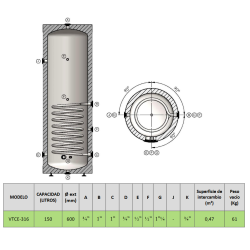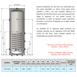 Depósito con doble serpentín para producción y acumulación de Agua Caliente Sanitaria (ACS). Funcionamiento estándar a 8 bars en Inox 316L. Calderín: Acero inoxidable, Capacidad: 150 litros, Serpentín Principal: 0,48 m2, Serpentín Auxiliar: 0,48 m2, Medidas: 102 x 60 cm, Resistencia opcional.