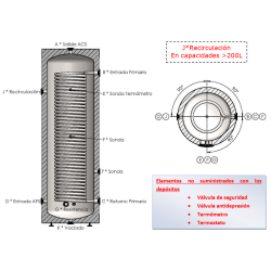 Depósito con doble serpentín para producción y acumulación de Agua Caliente Sanitaria (ACS). Funcionamiento estándar a 6 bars en Inox 444. Calderín: Acero inoxidable, Capacidad: 100 litros, Serpentín Sobredimensionado: 1,5 m2, Serpentín Auxiliar: 0,38 m2, Medidas: 105 x 50 cm, Resistencia opcional.