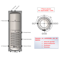 Depósito con conexiones en la parte superior para producción y acumulación de Agua Caliente Sanitaria (ACS). Funcionamiento estándar a 8 bars en Inox 316L. Calderín: Acero Inox, Capacidad: 100 litros, Serpentín: 1,50 m2, Medidas: 105 X 50 cm, Resistencia opcional.
