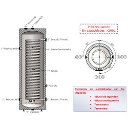 Depósito con doble serpentín para producción y acumulación de Agua Caliente Sanitaria (ACS). Funcionamiento estándar a 8 bars en Inox 316L. Calderín: Acero inoxidable, Capacidad: 500 litros, Serpentín Principal: 1,68 m2, Serpentín Auxiliar: 0,81 m2, Medidas: 200 x 72 cm, Resistencia opcional.