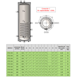 Depósito con conexiones en la parte superior para producción y acumulación de Agua Caliente Sanitaria (ACS). Funcionamiento estándar a 6 bars en Inox 444. Calderín: Acero inoxidable, Capacidad: 200 litros, Serpentín: 2,4m2, Medidas: 130 X 60 cm, Resistencia opcional.