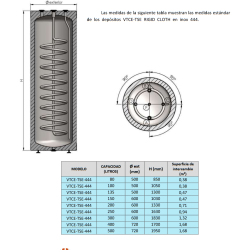 Depósito con serpentín diseñado para sistemas Forzados o Drain Back para producción de ACS por acumulación. Equipado con protección de ánodo de magnesio Material: INOX 444, Serpentín: 3 m2, Medidas: 215x56, Capacidad: 300 litros