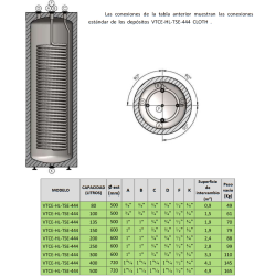 Depósito con serpentín extraíble y bocas de registro para producción y acumulación de Agua Caliente Sanitaria (ACS). Funcionamiento estándar a 8 bars en Inox 316L. Calderín: Acero inoxidable, Capacidad: 2000 litros, Serpentín Principal: 4,03 m2, Medidas: 215 x 130 cm, Tipos de boca de registro: DN400, Tipo de instalación: Vertical, Resistencia opcional.