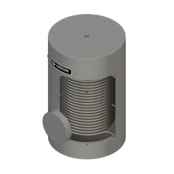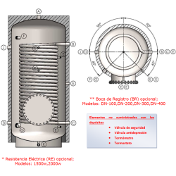 Depósito con conexiones en la parte superior para producción y acumulación de Agua Caliente Sanitaria (ACS). Funcionamiento estándar a 8 bars en Inox 316L. Calderín: Acero Inox, Capacidad: 150 litros, Serpentín: 0,47m2, Medidas: 103 X 60 cm, Resistencia opcional.