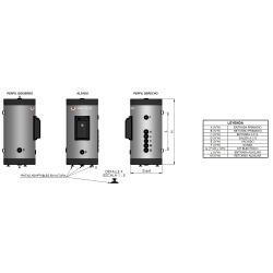 Depósito para producción y acumulación de Agua Caliente Sanitaria (ACS). Para un funcionamiento estándar a 8 bars en Inox 316L. Calderín: Acero Inox, Capacidad: 250 litros, Serpentín: 0,94m2, Medidas: 163 X 60 cm, Resistencia opcional.