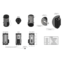Depósito con conexiones en la parte superior para producción y acumulación de Agua Caliente Sanitaria (ACS). Funcionamiento estándar a 6 bars en Inox 444. Calderín: Acero inoxidable, Capacidad: 100 litros, Serpentín: 1,5m2, Medidas: 105 X 50 cm, Resistencia opcional.