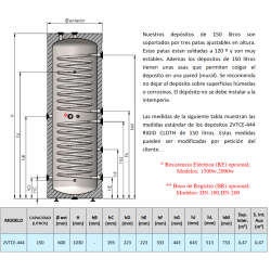 Depósito con doble serpentín para producción y acumulación de Agua Caliente Sanitaria (ACS). Funcionamiento estándar a 6 bars en Inox 444. Calderín: Acero inoxidable, Capacidad: 150 litros, Serpentín Principal: 0,48 m2, Serpentín Auxiliar: 0,48 m2, Medidas: 102 x 60 cm, Resistencia opcional.