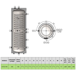 Depósito con doble serpentín para producción y acumulación de Agua Caliente Sanitaria (ACS). Funcionamiento estándar a 6 bars en Inox 444. Calderín: Acero inoxidable, Capacidad: 500 litros, Serpentín Principal: 1,68 m2, Serpentín Auxiliar: 0,81 m2, Medidas: 200 x 72 cm, Resistencia opcional.