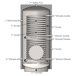 Depósito de Gran Volumen con Doble Serpentín para producción y acumulación de Agua Caliente Sanitaria (ACS). Funcionamiento estándar a 8 bars en Inox 316L. Calderín: Acero inoxidable, Capacidad: 1000 litros, Serpentín Principal: 3,48 m2, Serpentín Auxiliar: 2,72 m2, Medidas: 210 X 103 cm, Resistencia opcional.