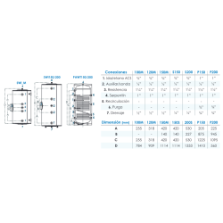 Depósito con doble serpentín para producción y acumulación de Agua Caliente Sanitaria (ACS). Funcionamiento estándar a 6 bars en Inox 444. Calderín: Acero inoxidable, Capacidad: 150 litros, Serpentín Principal: 0,48 m2, Serpentín Auxiliar: 0,48 m2, Medidas: 102 x 60 cm, Resistencia opcional.