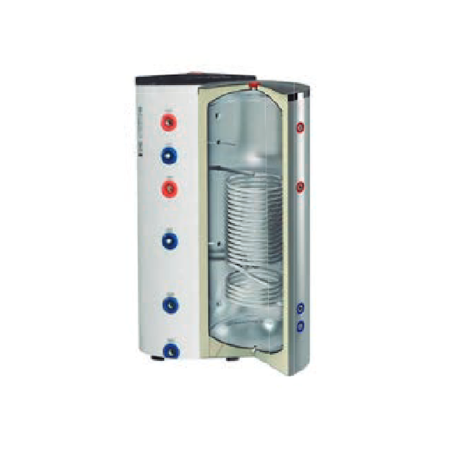 Depósito con doble serpentín para producción y acumulación de Agua Caliente Sanitaria (ACS). Funcionamiento estándar a 6 bars en Inox 444. Calderín: Acero inoxidable, Capacidad: 500 litros, Serpentín Sobredimensionado: 4,9 m2, Serpentín Auxiliar: 0,81 m2, Medidas: 200 x 72 cm, Resistencia opcional.